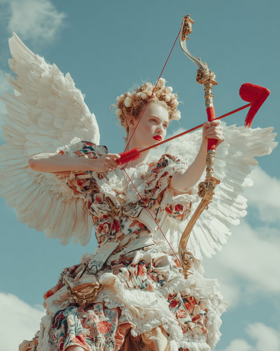 [Hook] 0–3s: Against a blue-sky background, a white-winged angel slowly draws a red longbow. The arrowhead points toward the camera. The camera rapidly pushes in to her cold gaze and red lips. Line 1 (Angel, cold judgment): “Those who loved but were not loved in return — today, I pass judgment.” SFX: Bowstring tightening; background sound suddenly cuts out. [Conflict Development] 4–9s: The camera circles around her, revealing her ornate patterned clothing and massive wings. Feathers drift in the wind. A delicate floral crown atop her head sways gently. The red arrow fletching glints in the sunlight. Line 2 (Angel, mocking whisper): “Did you think the god of love only spreads affection? Wrong… I also rule over betrayal and punishment.” SFX: Wings beating in the wind; mysterious choir-like background music rises. [Conflict Escalation] 10–12s: She slowly pulls the bow to its full draw. Red ribbons flutter in the air. Close-up on her determined expression as golden light flickers at the arrow tip. Line 3 (Angel, commanding declaration): “Those who betray true love shall be pierced by this arrow!” SFX: Bowstring trembling at maximum tension; background music surges. [Suspense Ending] 13–15s: She releases the string. The red arrow streaks across the sky like a beam of light. The frame freezes on her turning away, spreading her wings to fly off. Feathers scatter in the air. In the distant sky, a blood-red crack appears. Line 4 (Distant scream, anguished): “No… why…” SFX: Arrow slicing through the air, followed by sudden silence — only the soft rustling of falling feathers remains. Overall style: High-saturation dreamy color palette, strong contrast of gold, red, and white. Cinematic fantasy texture, soft natural lighting, rich feather particle effects. Restrictions: No subtitles, logos, or watermarks in any scene.
