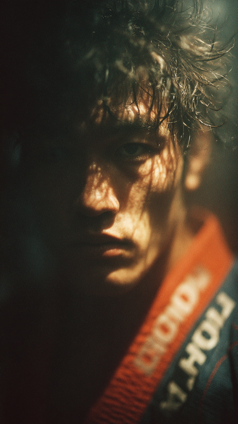 analog 35mm film photograph, behind-the-scenes production still, candid moment, shot on Kodak Portra 400 pushed to 800, athletic Asian man in his 30s with wild spiky black hair wearing orange and blue martial arts gi, heavily out of focus in foreground, extreme shallow depth of field, natural golden hour side lighting with soft rim glow, handheld camera motion blur, heavy film grain texture, desaturated vintage color grading with muted cool grays and warm highlights, crushed blacks lifted shadows, halation glow around edges, atmospheric haze, eye-level slightly low angle, documentary style cinematic, 1990s martial arts film production photography aesthetic, intimate behind-the-scenes quality, --chaos 15 --ar 9:16 --raw --stylize 350 --v 7